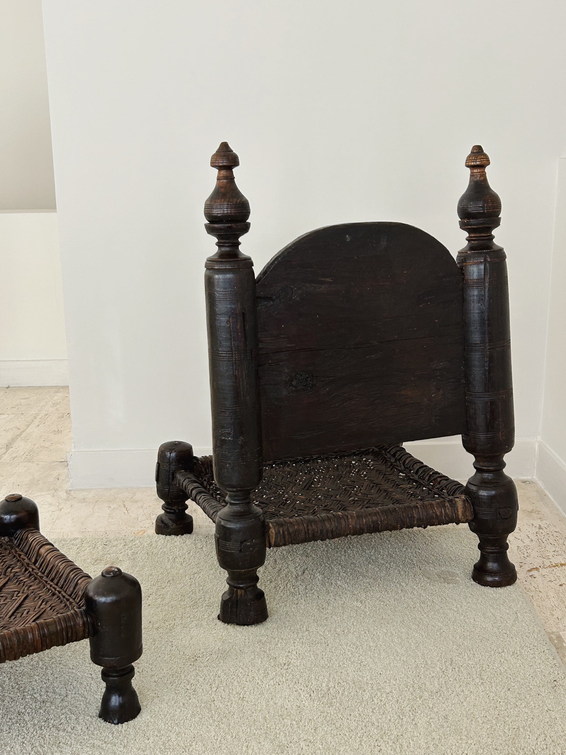 Antique Afghan temple chair with stool crafted from hardwood with seats made of tightly plaited leather, most likely 19th century.
