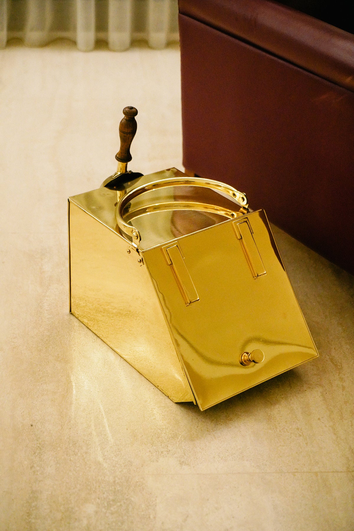 Brass fireplace scuttle coal box with scoop